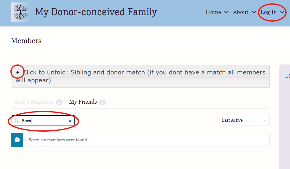 The website’s search function can be accessed by clicking the small arrow to the right of the “Log in” tab and selecting “Sibling match” from the drop-down menu. This will take you to the page displaying all members. You can use the simple search by typing the name of the sperm bank, donor number, or alias you’re looking for in the box with the magnifying glass. Alternatively, you can use the advanced search by clicking the “+” icon on the top bar, where you can search by multiple criteria simultaneously. Please note that in the advanced search, all members will appear if no results match the criteria you’ve selected.